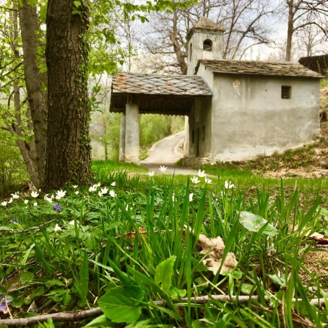 La cappella è avvolta per 3/4 dalla fitta vegetazione e dinanzi le si apre la valletta del Piova, mentre all'orizzonte spiccano le vette della Quinzeina e del Verzel.