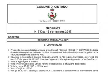 ORDINANZA CHIUSURA STRADA VIA ALPI IL 14 SETTEMBRE 2017
