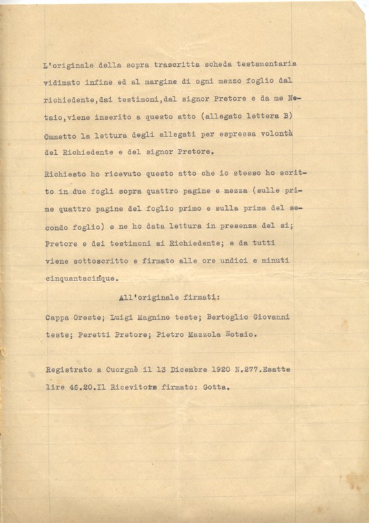Morì il 17 novembre 1920 per un malore. Lasciò nel testamento varie somme alle scuole e all'ospedale di Cuorgnè e 3.000 lire per un ammodernamento delle scuole di San Colombano e Cintano. La divisione della somma creò però un contenzioso tra i due comuni che durò parecchi anni.