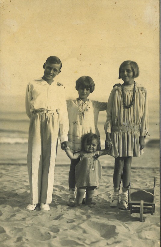 spiaggia di Alassio,1930 circa. Sono presenti: Antonio (1918), Bianca (1923), Mariellina (1921) e Mirella (1929), ovvero la madre di Luigi e Laura Laurini. L’ultima figlia, Erminia, non è presente perché nasce nel 1932.